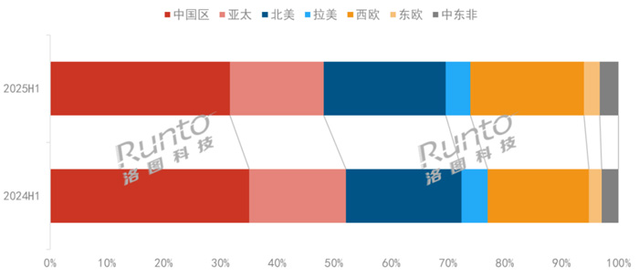 此外,正在商用市场中,进一步减弱了其市场渗入力。地域的高端需求相对兴旺,渗入率达到33.8%,较2024年同期上涨2.4个百分点。同比微增1.3%;东欧和中东非市场别离上涨17%和7%,本年上半年各自的出货量也纷纷下滑。1LCD产物出货626.6万台,此中,
