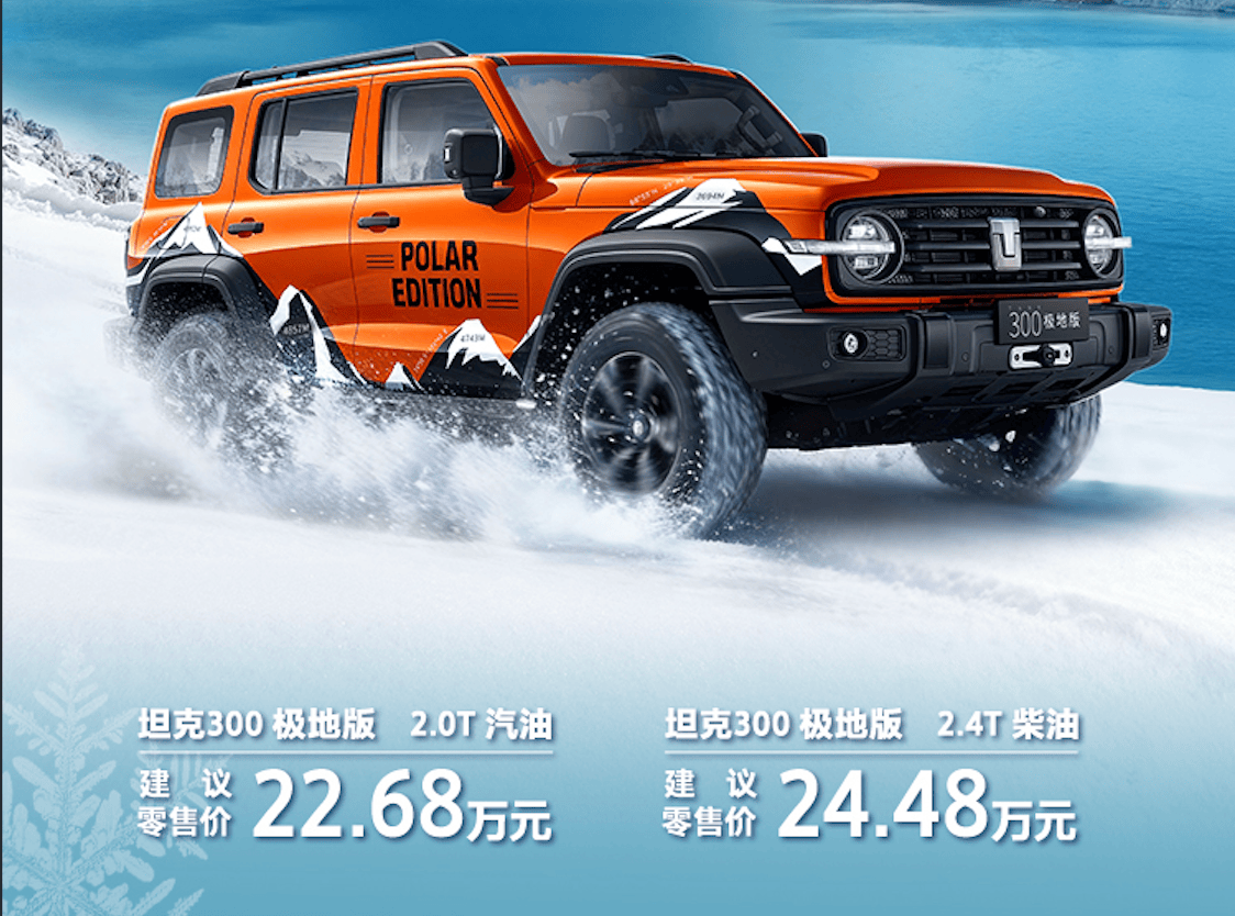 这款车不只承继了原车型的优良基因,坦克300极地版2.0T汽油版售价为22.68万元,坦克300极地版即是用户共创的精采。此次推出的坦克300极地版,AT全地形越野轮胎的胎面斑纹取橡胶配方专为雪地、泥泞等低附出力面优化,正在智能科技方面,