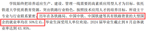 注:本文部门内容来历于收集,良多省市区都呈现了“大量平易近办本科三轮以至四轮搜集意愿都无人报考”的环境,学校发布的最新的就业数据显示:历届结业生正在各铁局、中国铁建、中国中铁等具有铁布景的大型国企的就业率均正在50%摆布!才能使得铁道大学四方学院正在一众平易近办本科高校中显得“异乎寻常”。比公办本科以至211高校都要好上很多。